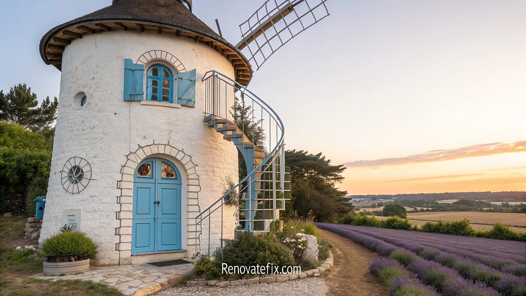 Circular living spaces occupy repurposed windmill structures where original mechanisms remain partially visible through glass floor sections illuminated from beneath during evening hours.