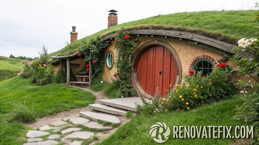 Burrowed partially into verdant hillsides, these hobbit-inspired homes showcase circular doorways framed by vibrant flowerbeds and curved walls that follow natural terrain contours.