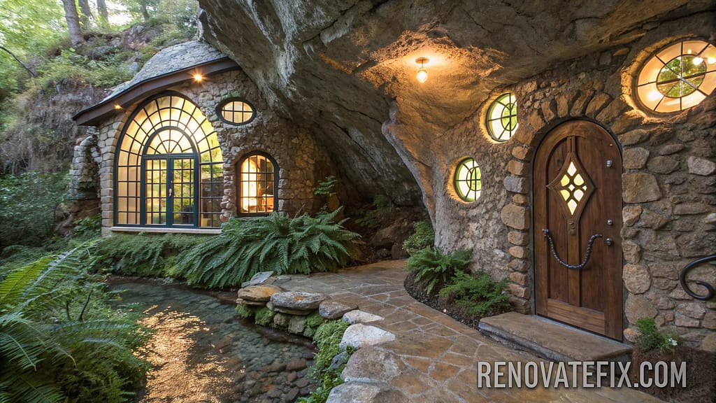 Earth-sheltered construction maintains consistent interior temperatures regardless of seasonal extremes, embodying sustainable principles while evoking storybook illustrations.