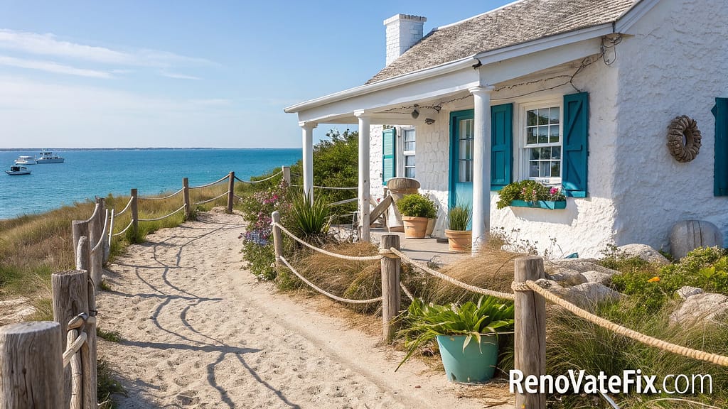 Rope accents appear throughout as functional elements and decorative touches, nodding toward nautical heritage while providing practical solutions for hanging utensils or potted herbs near windows that frame breathtaking ocean panoramas.