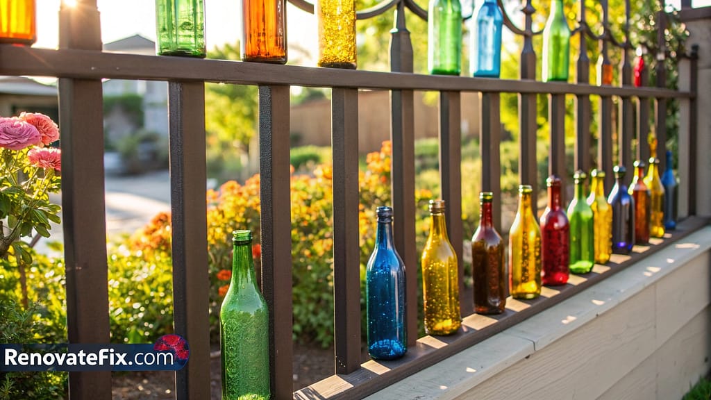 Mount weatherproof mirrors with decorative frames along fence sections to create optical illusions and expand perceived space.