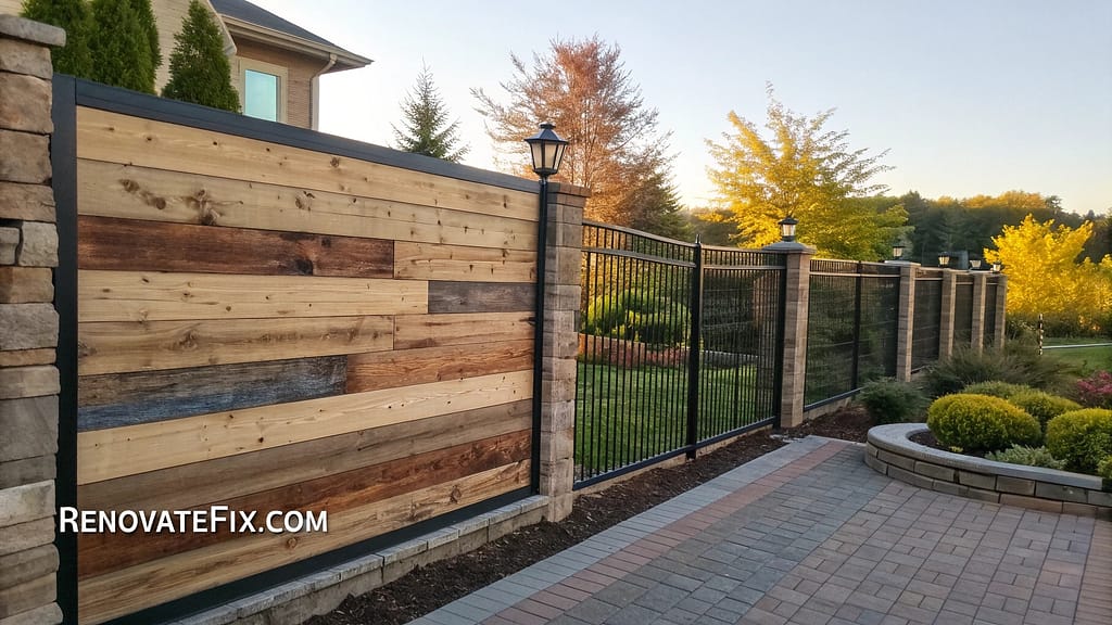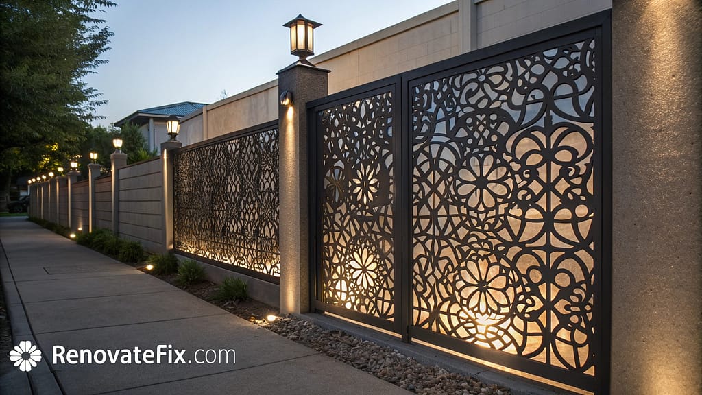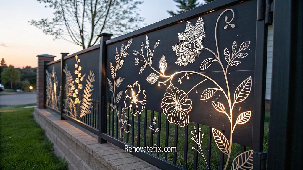 Integrate smart solar-powered lighting elements that illuminate fence sections during evening hours.