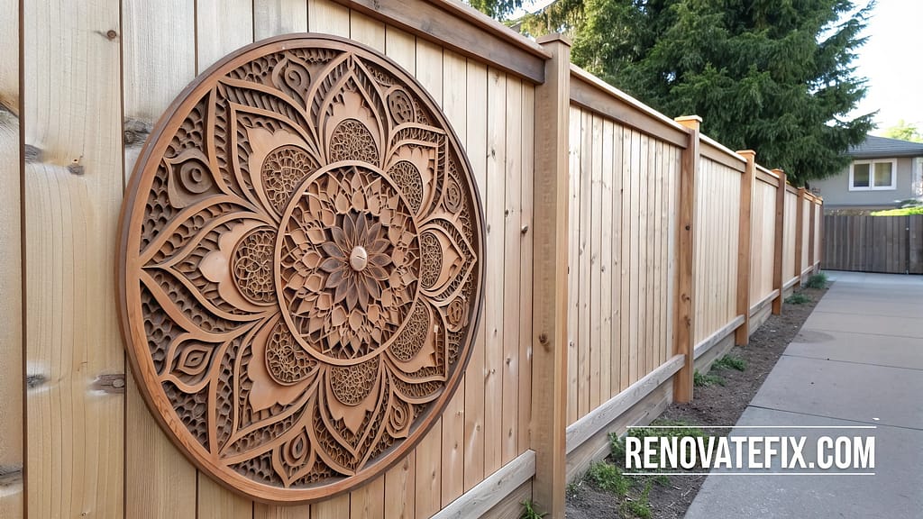 Hand-carve intricate mandala designs into wooden fence panels using precision tools and techniques.