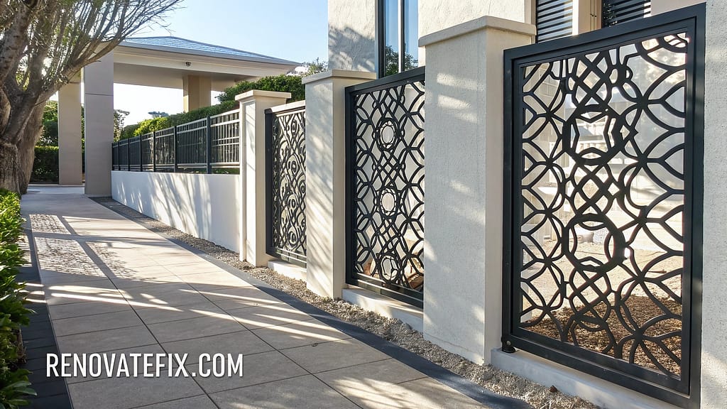 Elevate fence aesthetics with precision-cut metal artwork featuring abstract geometric shapes.