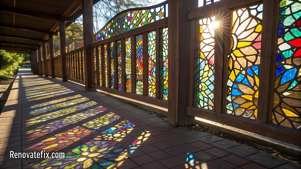 Integrate colorful mosaic glass panels crafted from recycled window fragments, stained glass pieces, and ceramic shards.