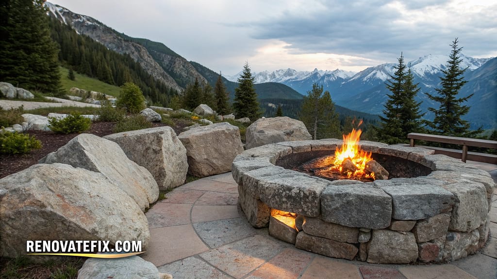 Massive granite boulders arranged in circular formations create dramatic fire pit enclosures with substantial visual impact.