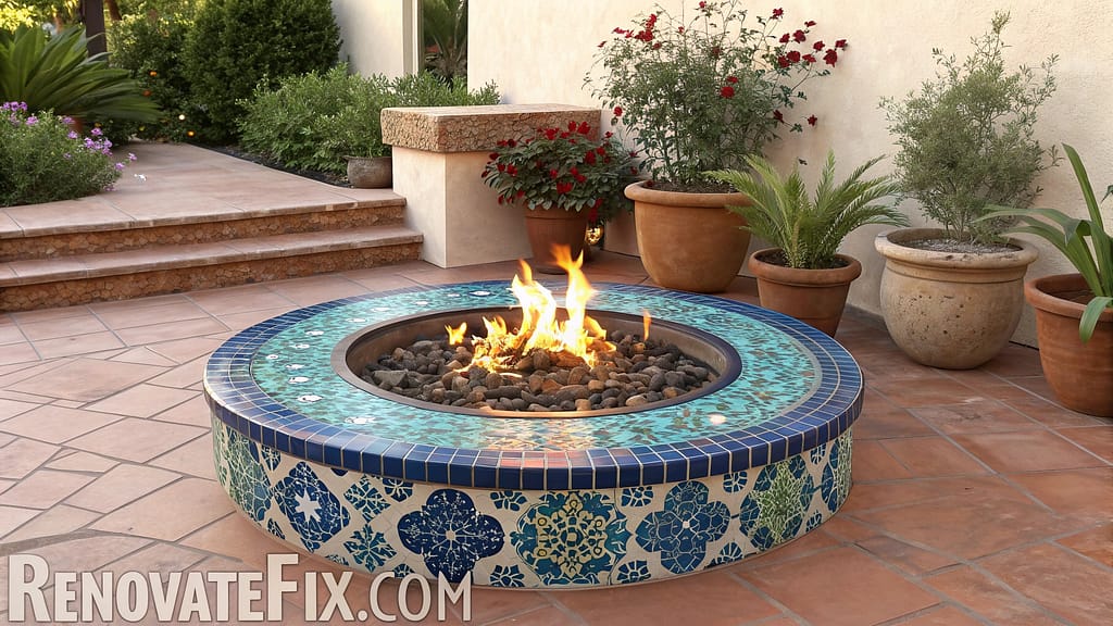 Colorful tile work adds artistic flair to fire pit designs, creating one-of-a-kind pieces that express personal style.