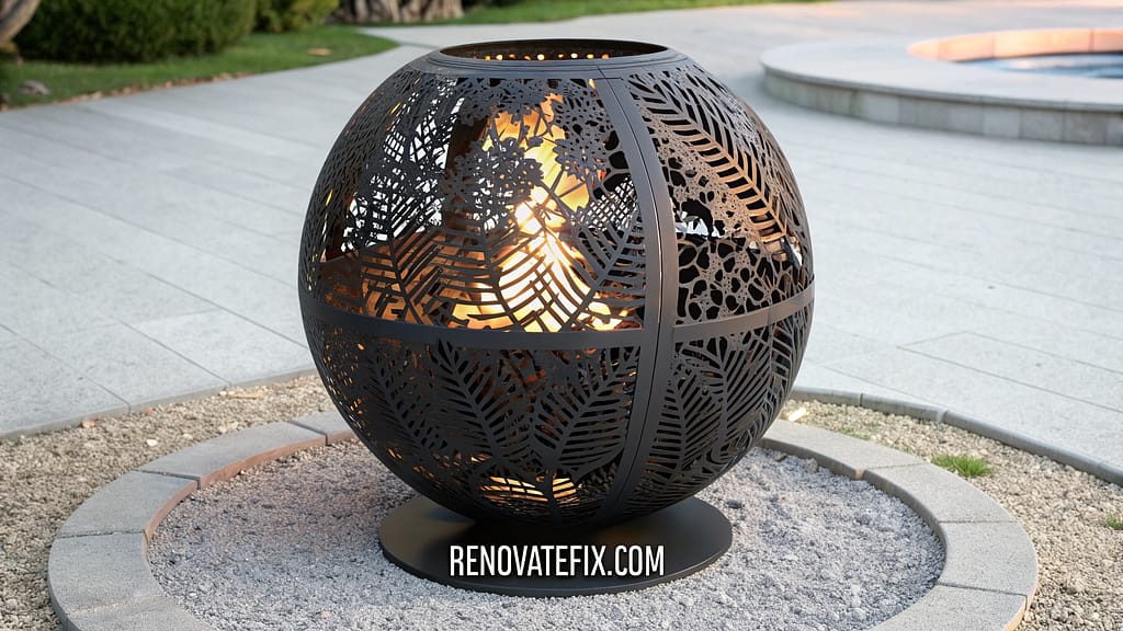 Perforated metal spheres create artistic fire pit options that combine functionality with sculptural appeal.