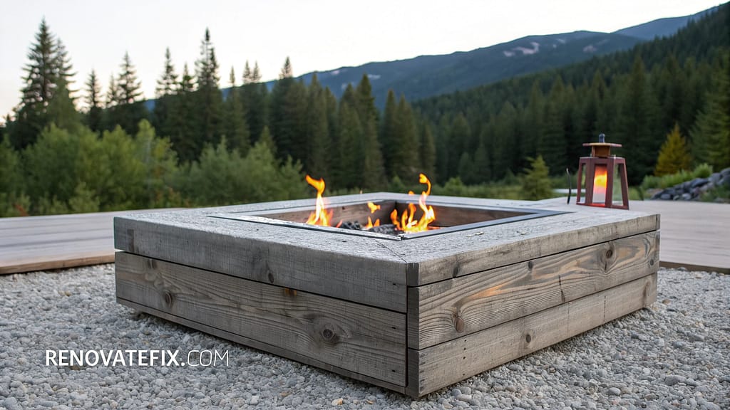 Reclaimed wooden beams arranged in square or rectangular formations create rustic seating areas that double as fire pit borders.