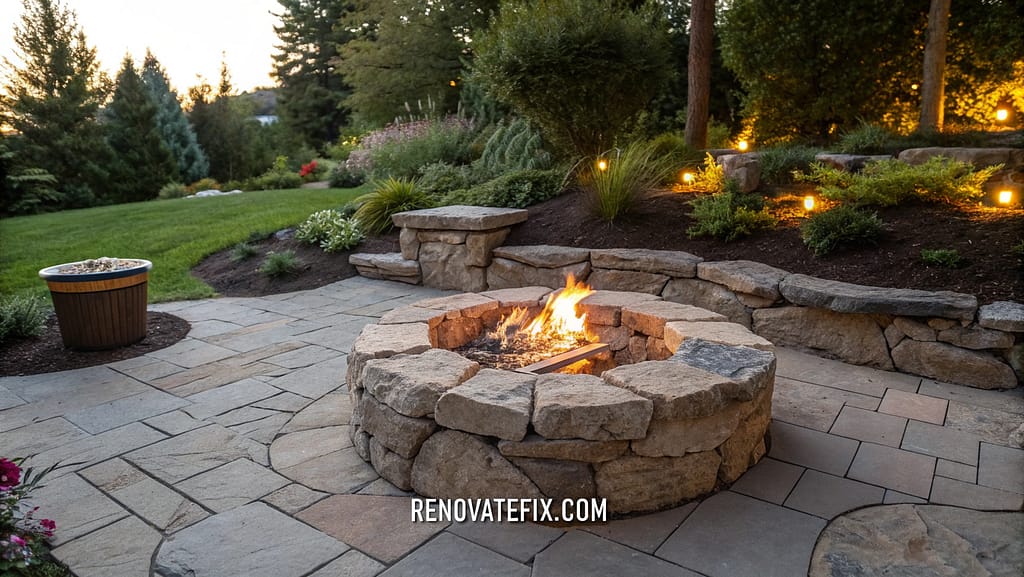 Irregular flagstone pieces create organic-looking fire pit surrounds that blend seamlessly with matching patio surfaces.
