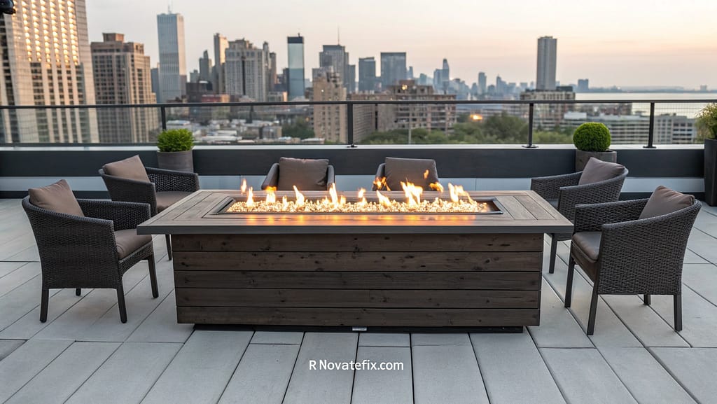 Multifunctional propane-powered tables combine dining surfaces with central flame features, maximizing space efficiency for smaller patios or decks.