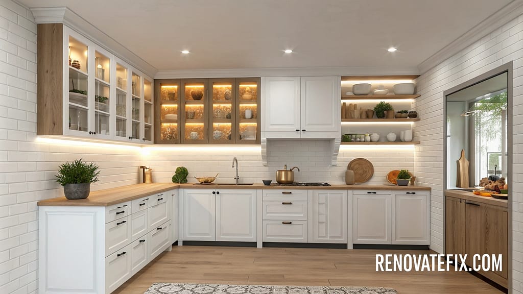 Mix traditional closed cabinets with strategic open shelving to display cherished items and create breathing space.