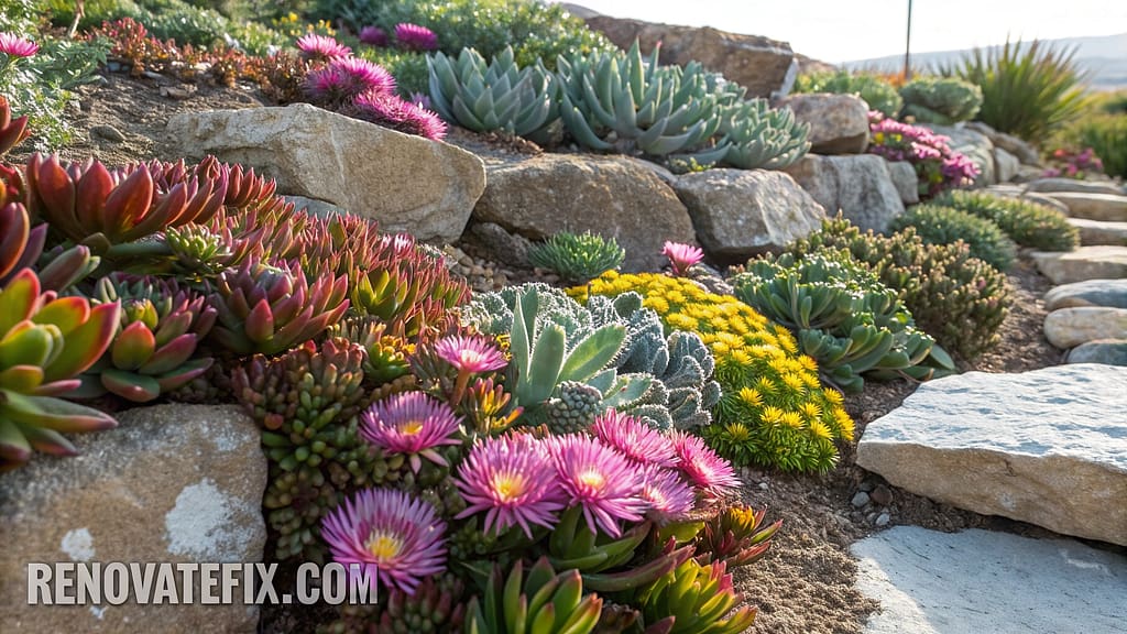 Build a striking low-water flower bed incorporating drought-resistant succulents and alpine plants that excel under blazing sun conditions.
