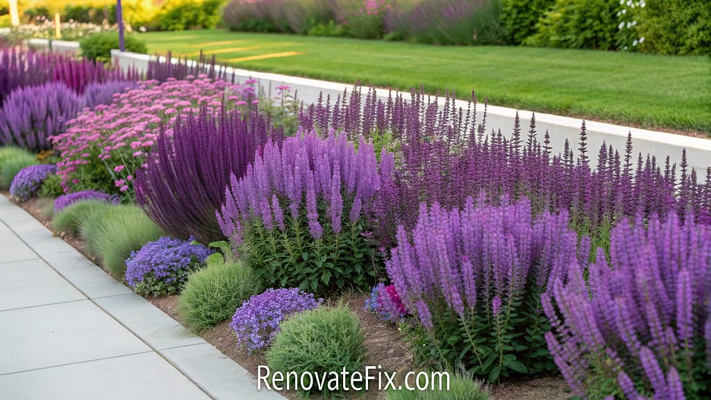 Purple salvias, verbenas, alliums and catmints blend harmoniously while offering textural variety and sequential blooming in sunny locations.