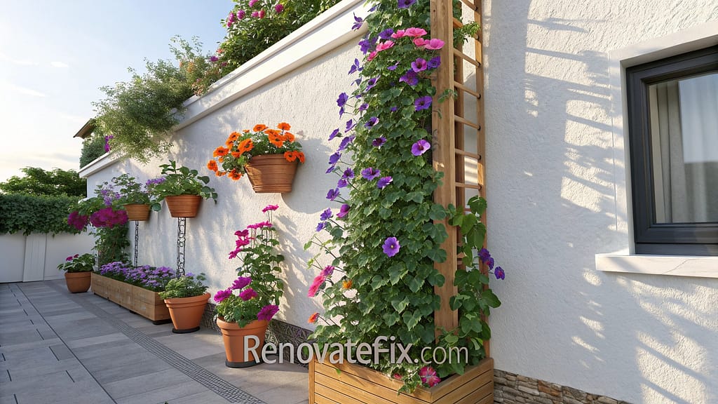 Morning glories, nasturtiums, trailing petunias and climbing roses flourish with vertical support while creating dramatic visual impact in tight areas receiving full sunlight.
