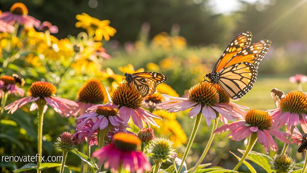 Butterfly bush, milkweed, bee balm and coneflowers provide continuous blooming from spring through fall, supporting diverse insect populations while creating vibrant visual displays.