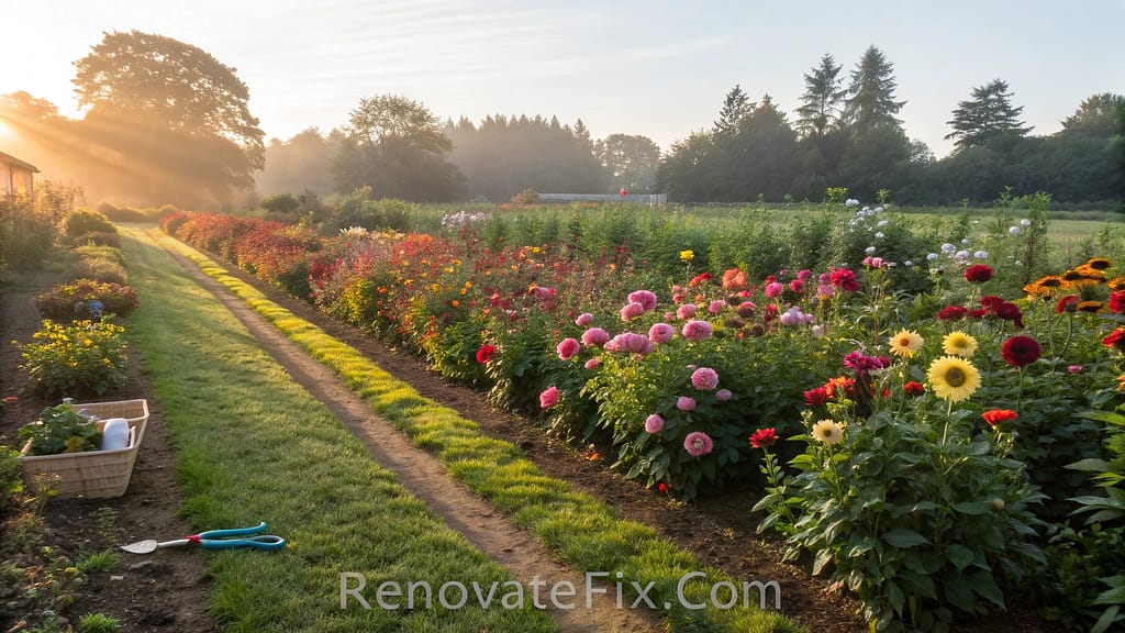 Plant parallel rows of flower varieties specifically grown for harvesting and indoor arrangements, maximizing sun exposure for strong stems and abundant blooms.