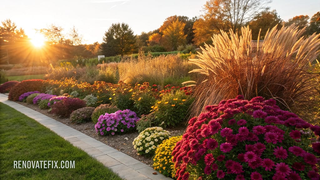 Asters, chrysanthemums, rudbeckias and ornamental grasses develop spectacular colors under autumn sunlight while maintaining structure through early frosts.
