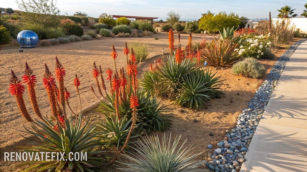 This approach balances delicate, lacy textures against bold forms while maintaining drought tolerance.