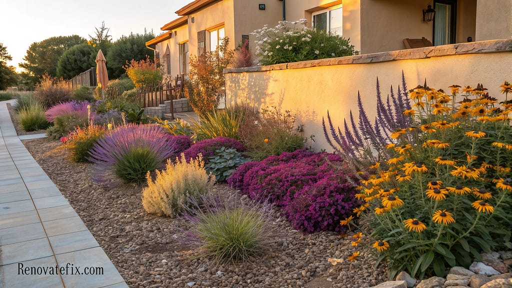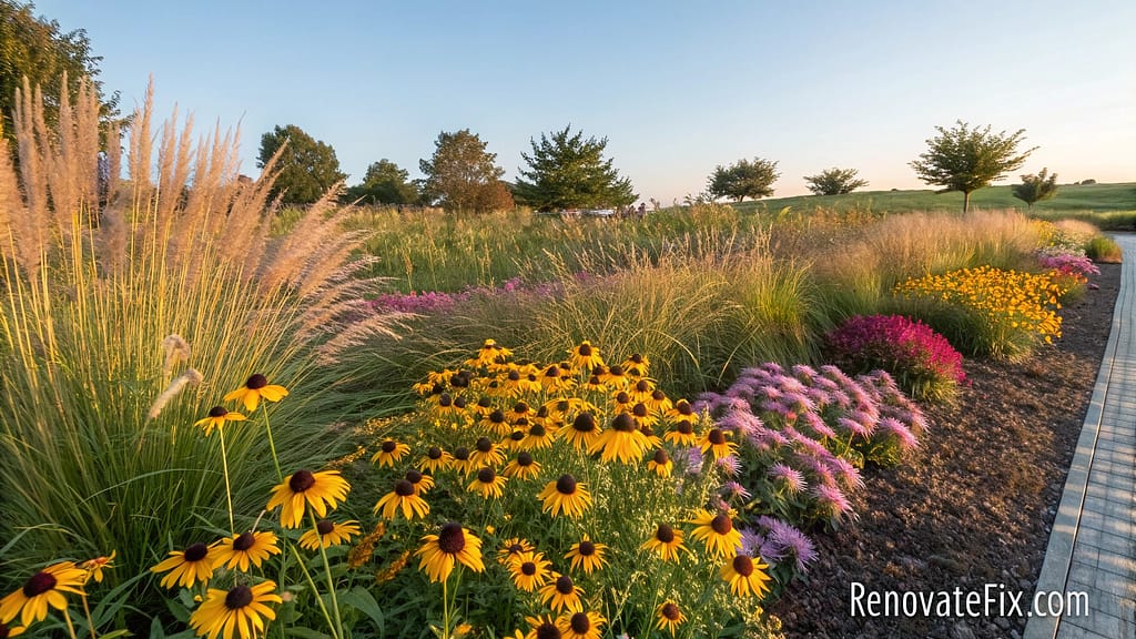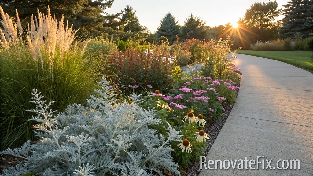 This approach combines ornamental grasses for movement with flowering perennials for seasonal interest, requiring minimal irrigation once established.