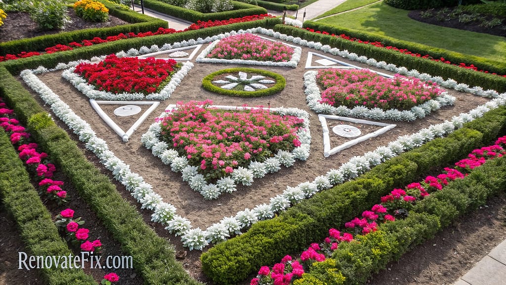 Construct a sophisticated symmetrical flower bed with clearly defined shapes filled with sun-loving annuals for consistent color impact.