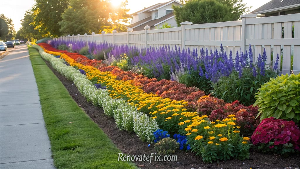 Arrange flowers in a progressive color sequence from cool purples through warm reds, creating a stunning visual flow along a sunny walkway or fence line.
