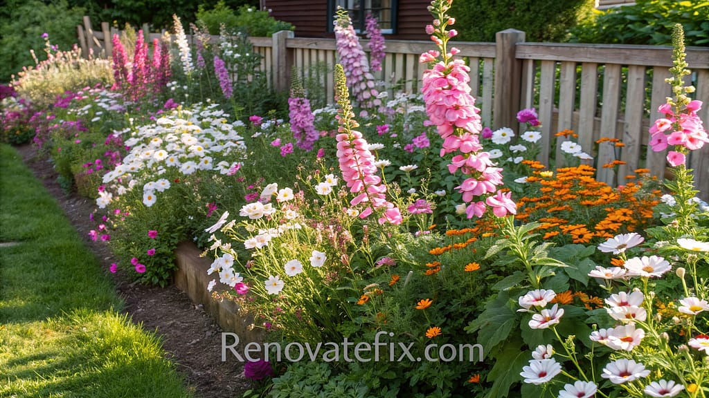 This artistic approach uses height variations with tall delphiniums and snapdragons at the back, medium zinnias and coneflowers in the middle, and short marigolds or portulaca as front edging.