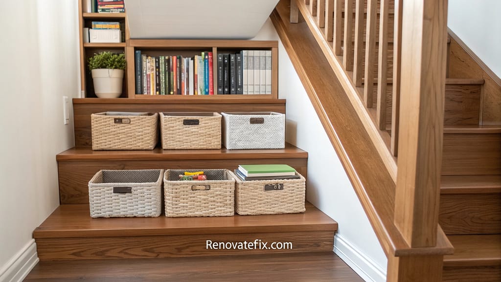 This method prevents clutter accumulation at the base of stairs while establishing an intuitive organization routine that even young children can follow.