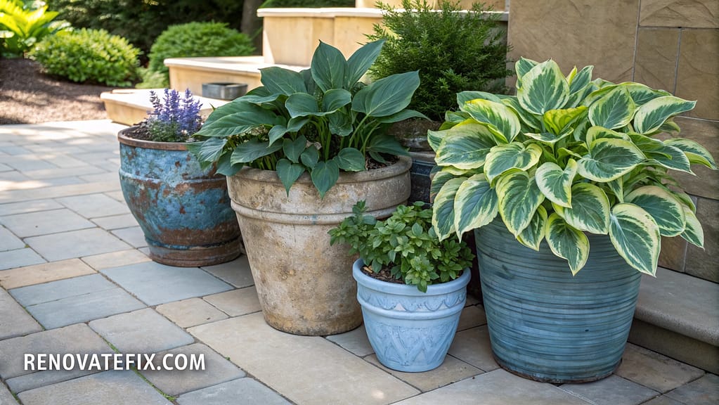 Potted hosta arrangements allow for dramatic height variations and color combinations on patios, porches, and decks.