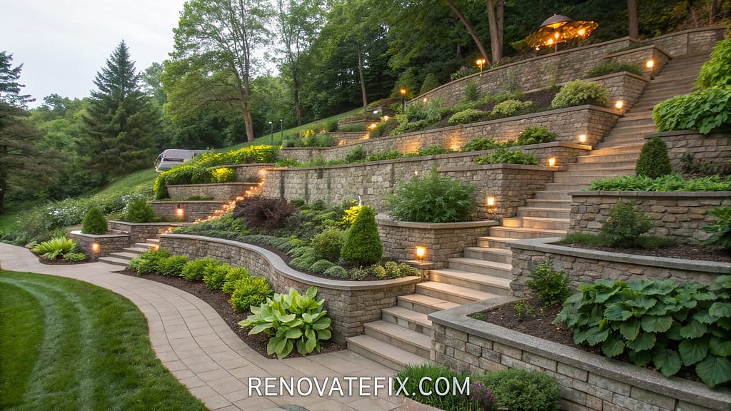 Maximize sloped terrain through terraced planting systems showcasing hostas at multiple viewing levels.