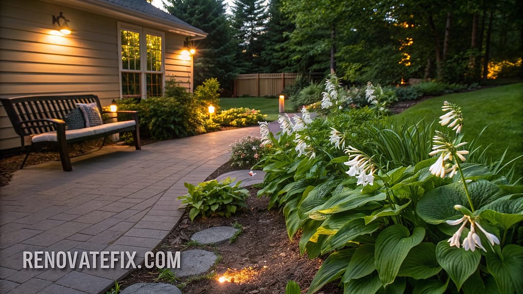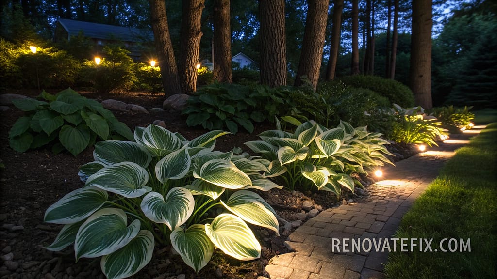 Highlight light-colored or variegated hostas in evening garden settings where their foliage captures and reflects moonlight or landscape lighting.