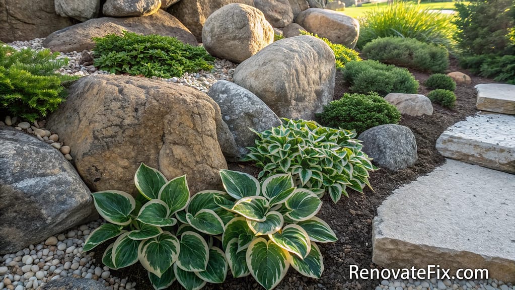 Integrate small and medium hostas among rock garden compositions to soften hard edges and introduce contrasting textures.