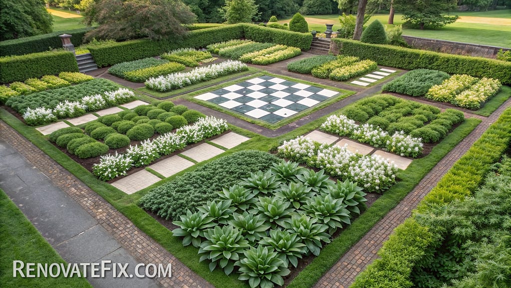 Create checkerboard effects by alternating green and variegated cultivars, or establish concentric circles radiating outward from central focal points.