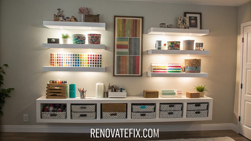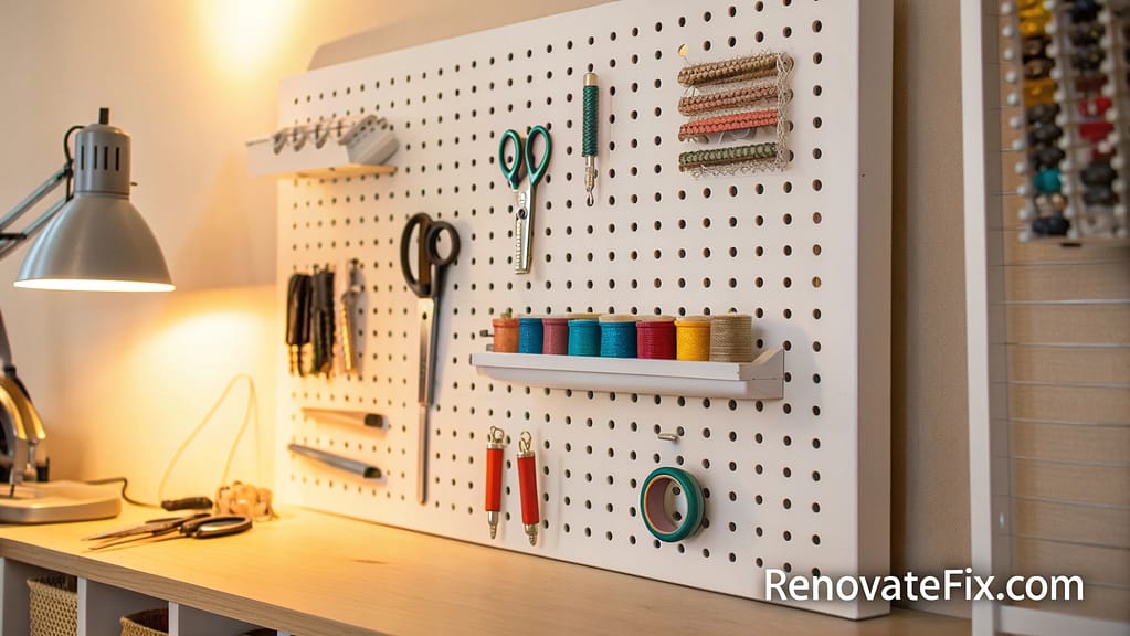 This customizable wall-mounted solution keeps essential items within arm’s reach while maintaining clear workspace surfaces, improving workflow efficiency in your craft room.