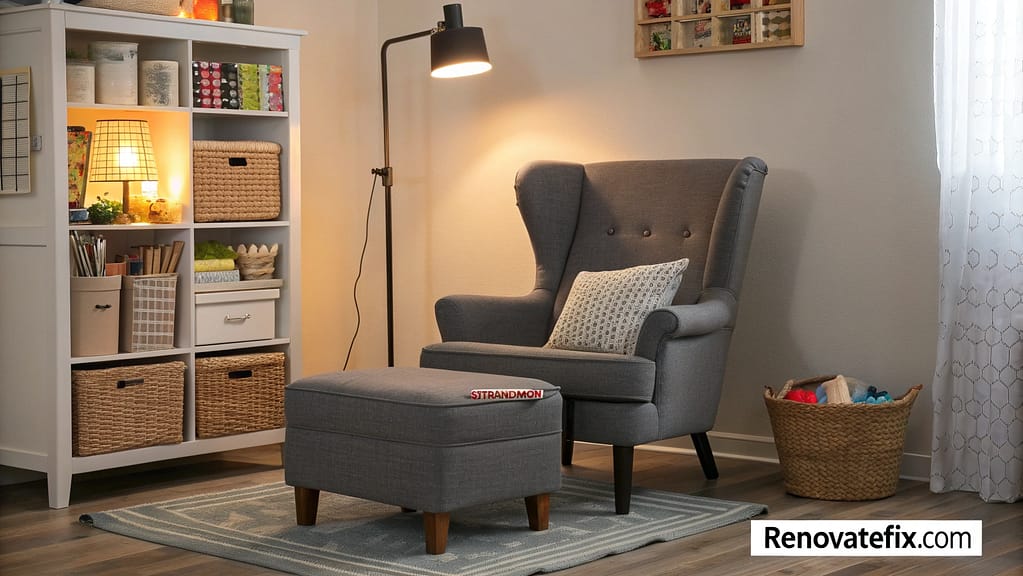 An IKEA STRANDMON wing chair paired with an ottoman featuring hidden storage creates a cozy crafting nook.