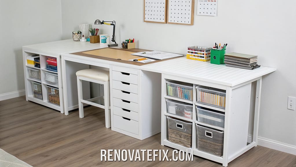 This customizable system incorporates workspace and storage in a minimal footprint, ideal for apartment crafters or shared spaces requiring efficient organization.