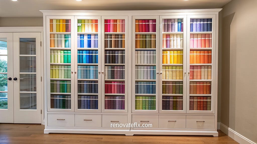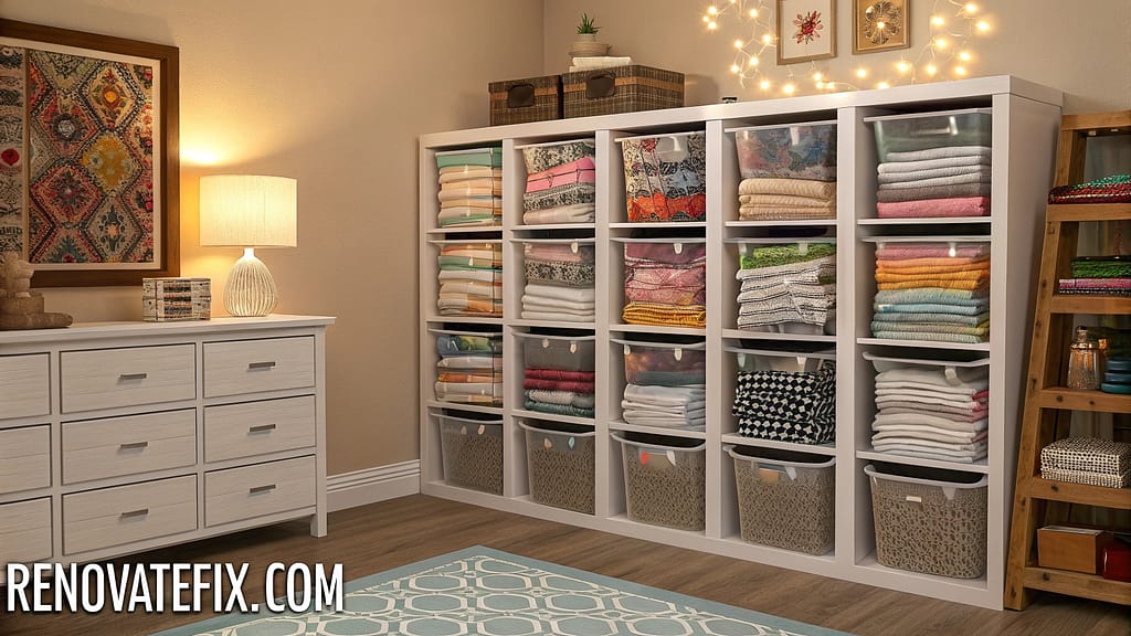 This systematic approach to fabric storage allows for easy visualization of available materials while protecting them from dust and fading, making project planning more efficient.