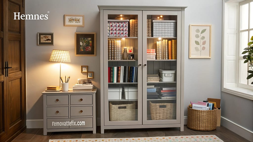 HEMNES glass-door cabinet showcases and protects valuable crafting supplies while adding sophisticated storage to your space.