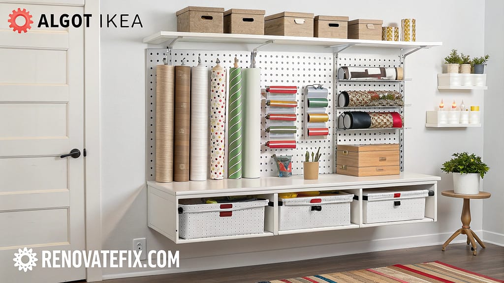 ALGOT wall-mounted rails and accessories create a dedicated gift-wrapping station.