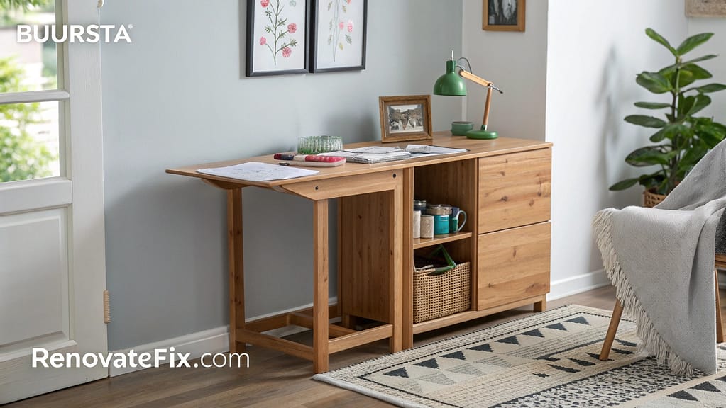 A wall-mounted IKEA BJURSTA drop-leaf table provides an instant crafting surface that folds away when not needed.