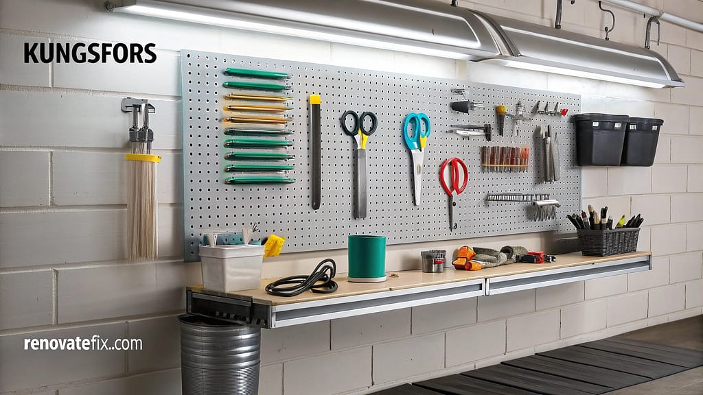 An IKEA SKÅDIS pegboard system creates an adaptable wall display for tools and supplies, combining functionality with visual appeal.