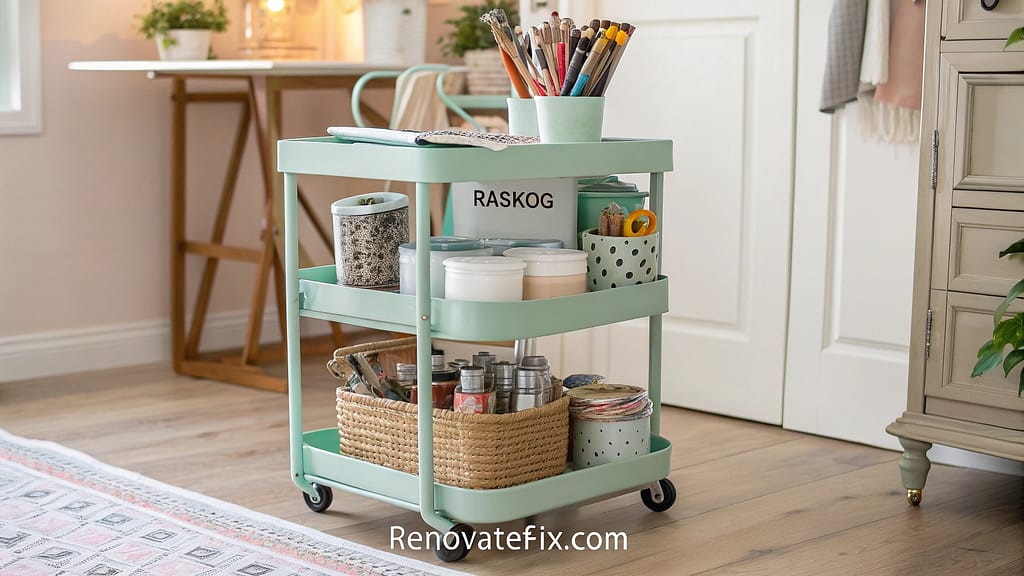 A customized RÅSKOG utility cart serves as a mobile crafting station, featuring multiple tiers stocked with frequently used supplies.