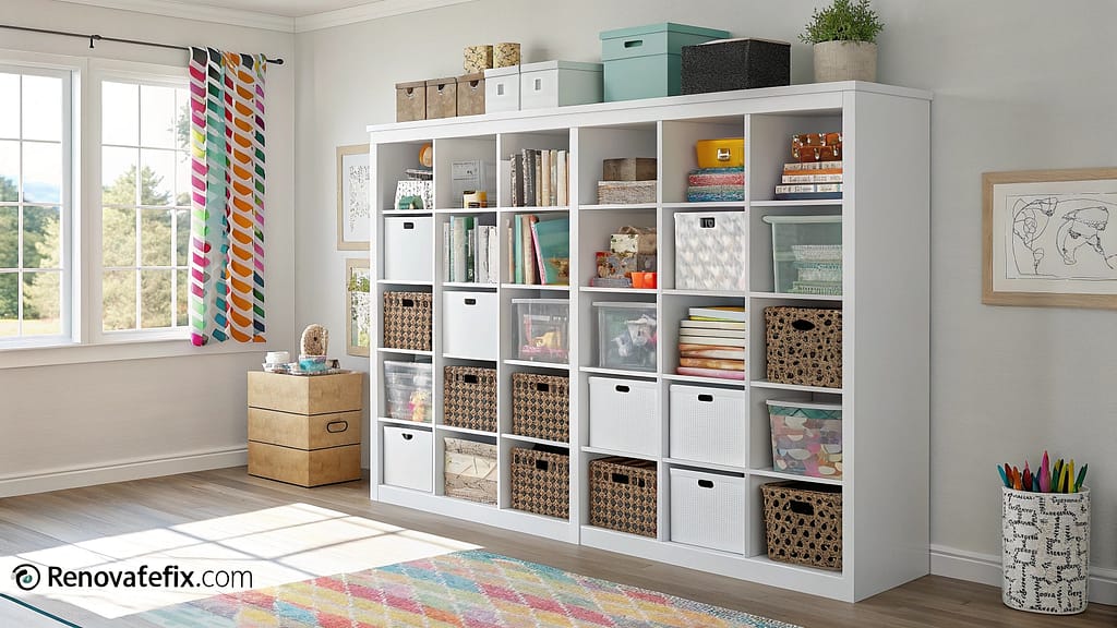 This eye-catching configuration doubles as both functional storage and room decor, offering easy access to materials while showcasing your creative achievements in style.