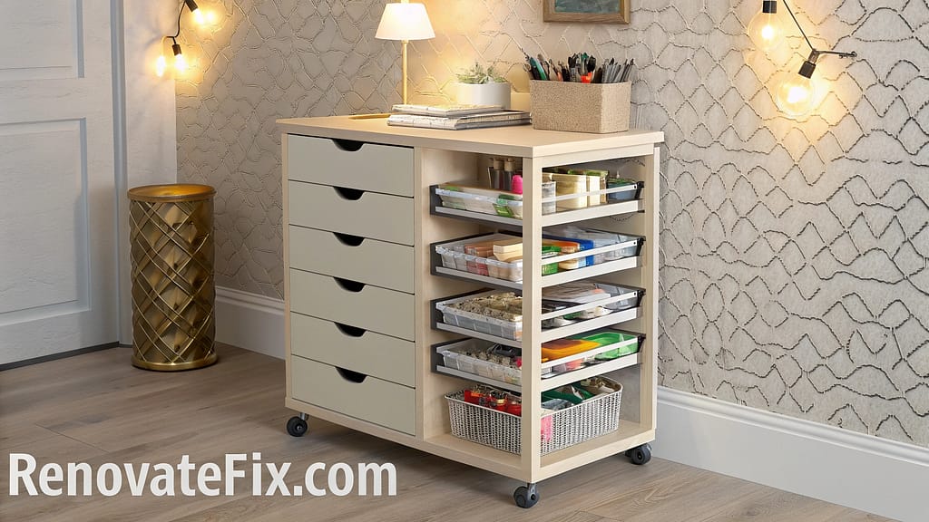 Multiple drawers house different supply categories, while the top surface provides additional workspace or displays current projects, making it an ideal companion to any main crafting area.