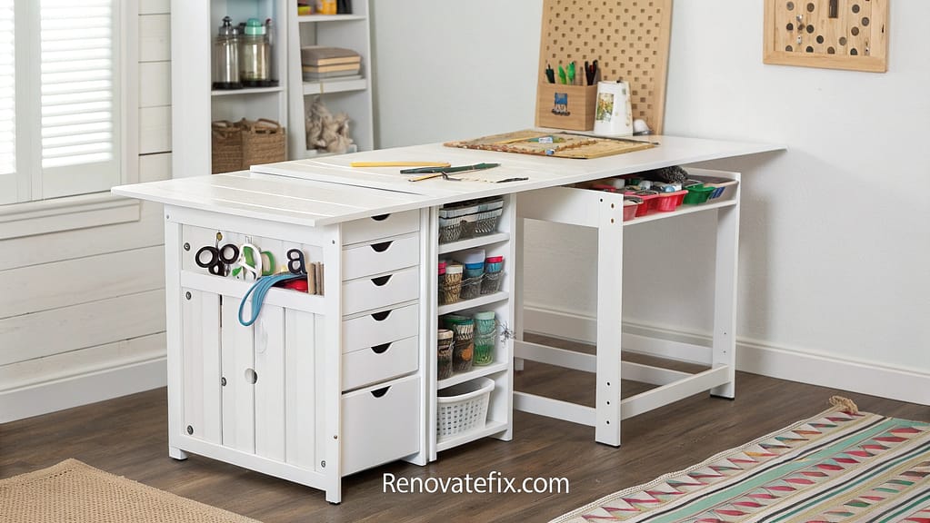 This space-saving marvel opens up to reveal ample workspace for projects while maintaining a clean look when closed, perfect for crafters in compact living situations.