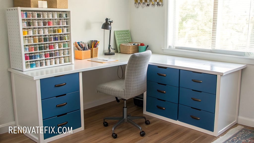 This space-efficient setup utilizes vertical storage solutions and under-desk organization to create a fully functional craft area in minimal square footage, perfect for small room optimization.