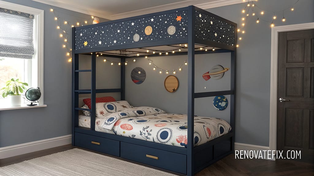 Paint the frame deep navy blue, mount glow-in-the-dark stars on the ceiling panel, and add LED strip lighting to create space-themed ambiance.