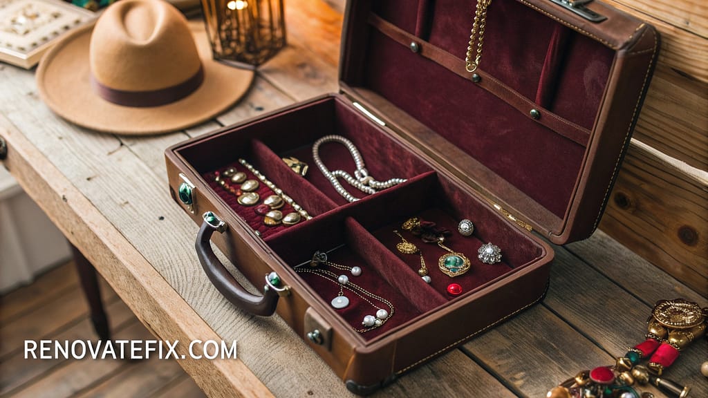 Repurpose an antique leather suitcase into a charming display piece by adding velvet-lined compartments and small hooks.