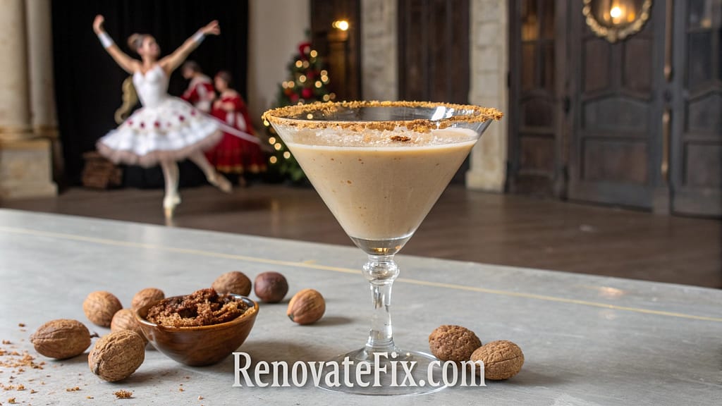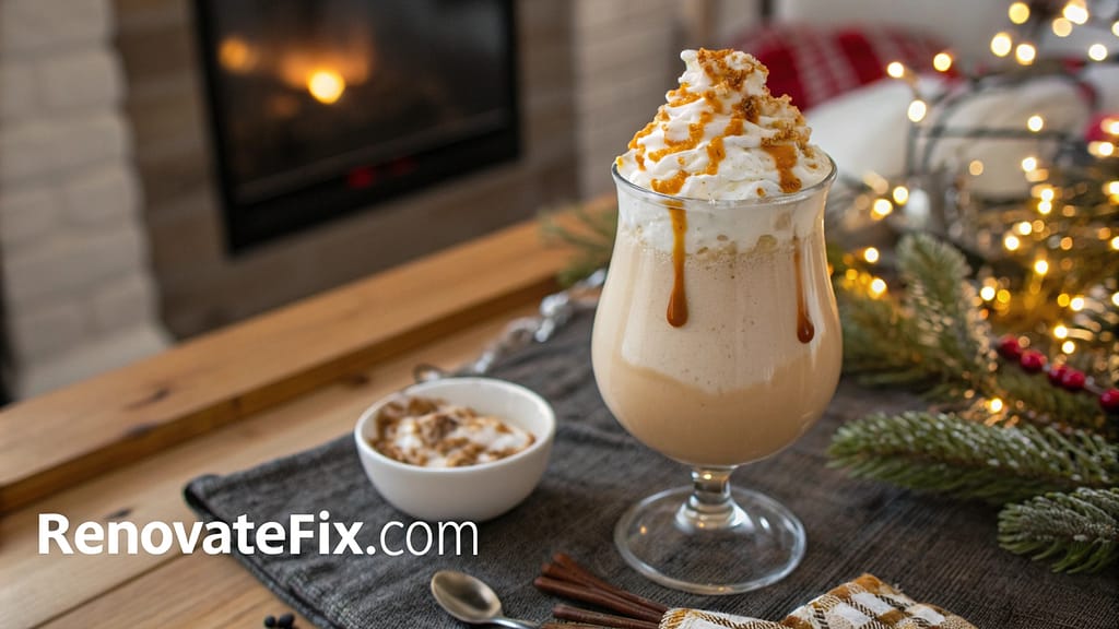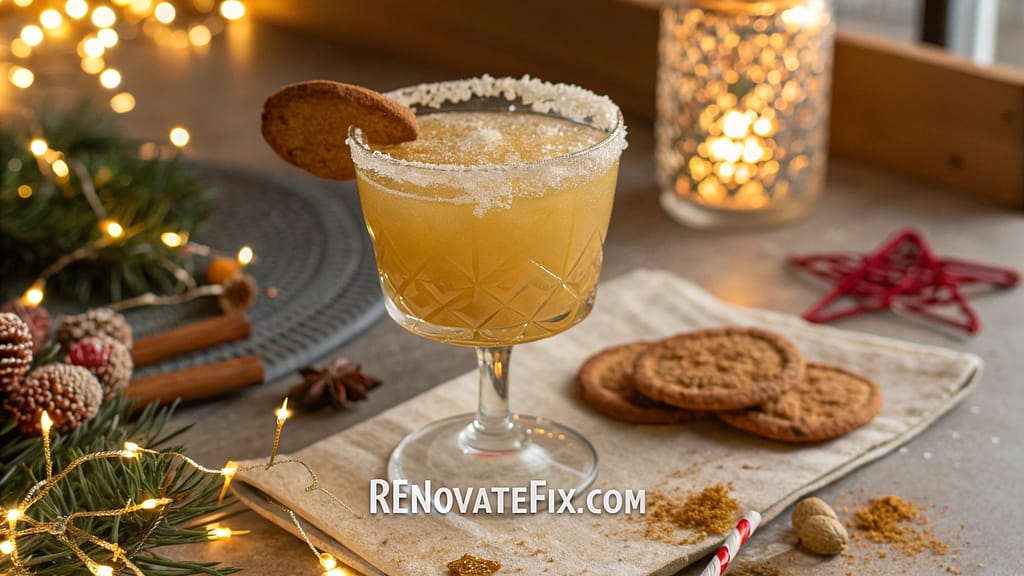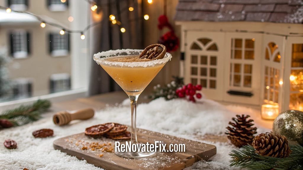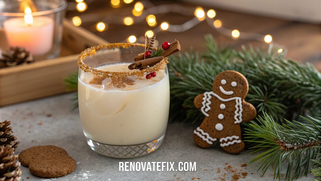 Brown sugar and nutmeg rim sparkles like frost, while tiny gingerbread cookies perch playfully on glass edges.
