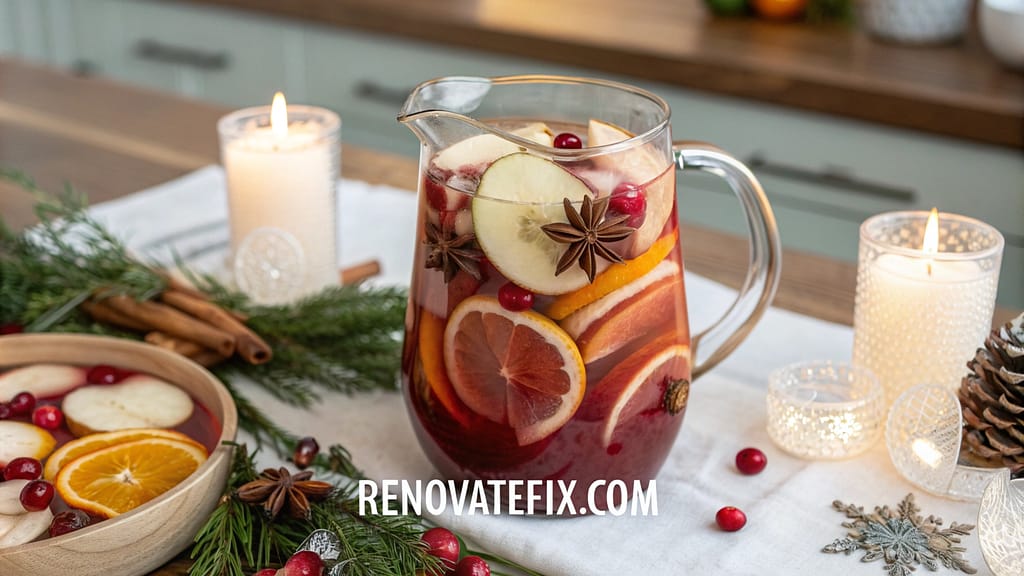 Red wine embraces winter fruits – pomegranate, cranberries, and orange slices create liquid jewels.